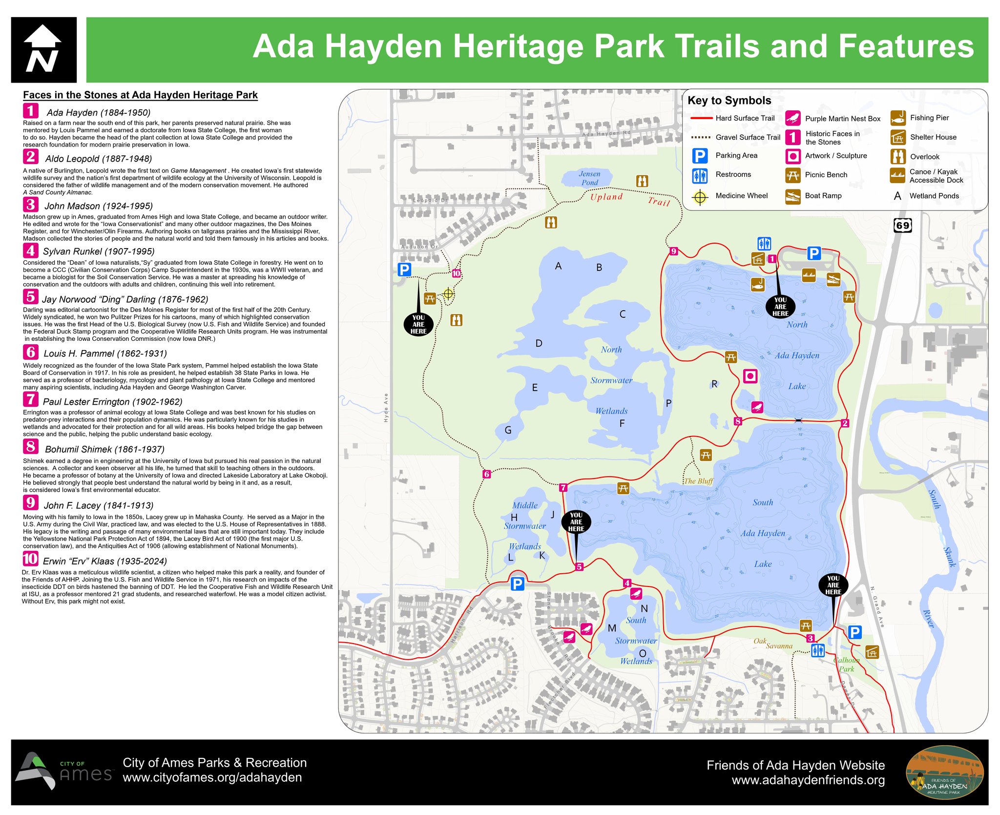 Ada Hayden Heritage Park in Ames, Iowa, is a scenic outdoor destination centered around the 83-acre Ada Hayden Lake. The park offers visitors a variety of recreational opportunities including walking and biking trails, picnic areas with shelters, fishing access, and open green space for casual play or relaxation.
