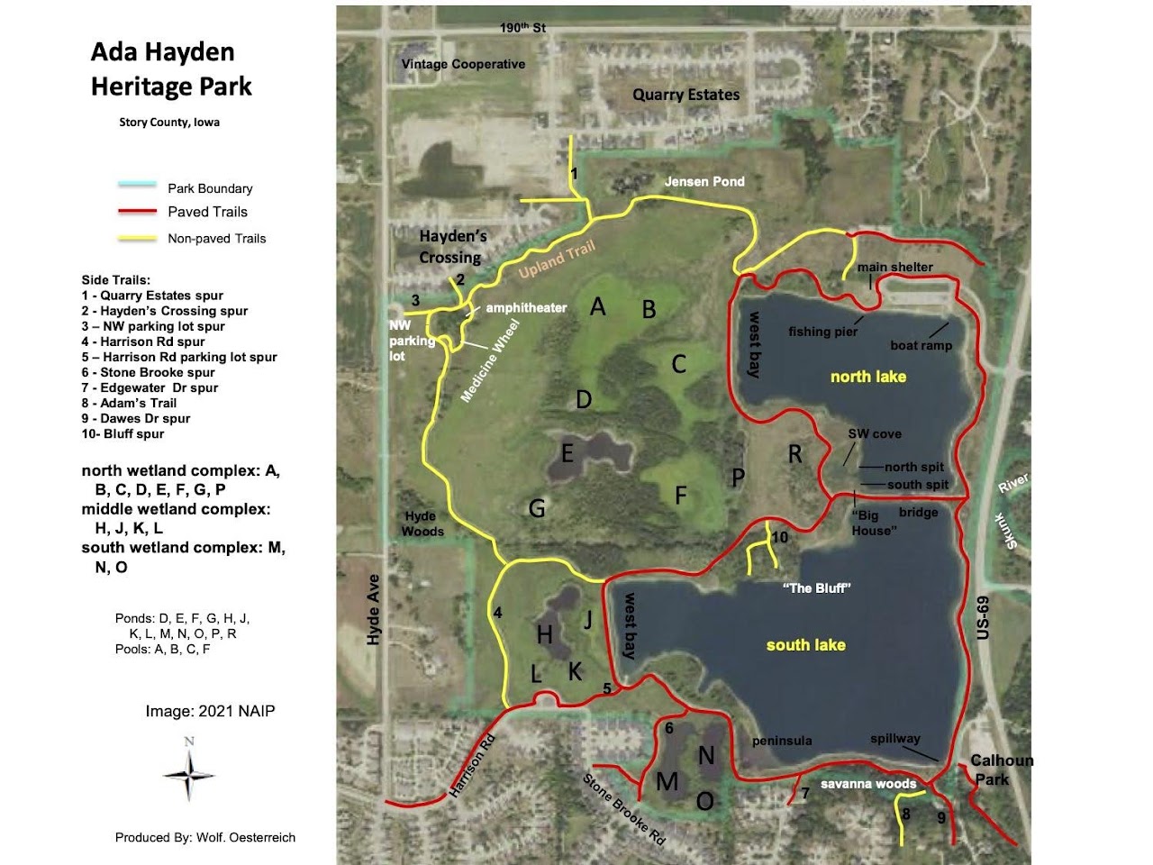 The park’s paved trail system circles the lake, making it a popular spot for walkers, runners, and cyclists of all ages and abilities. With interpretive signage, abundant wildlife viewing, and peaceful water views, Ada Hayden Heritage Park provides a natural retreat near the heart of Ames.