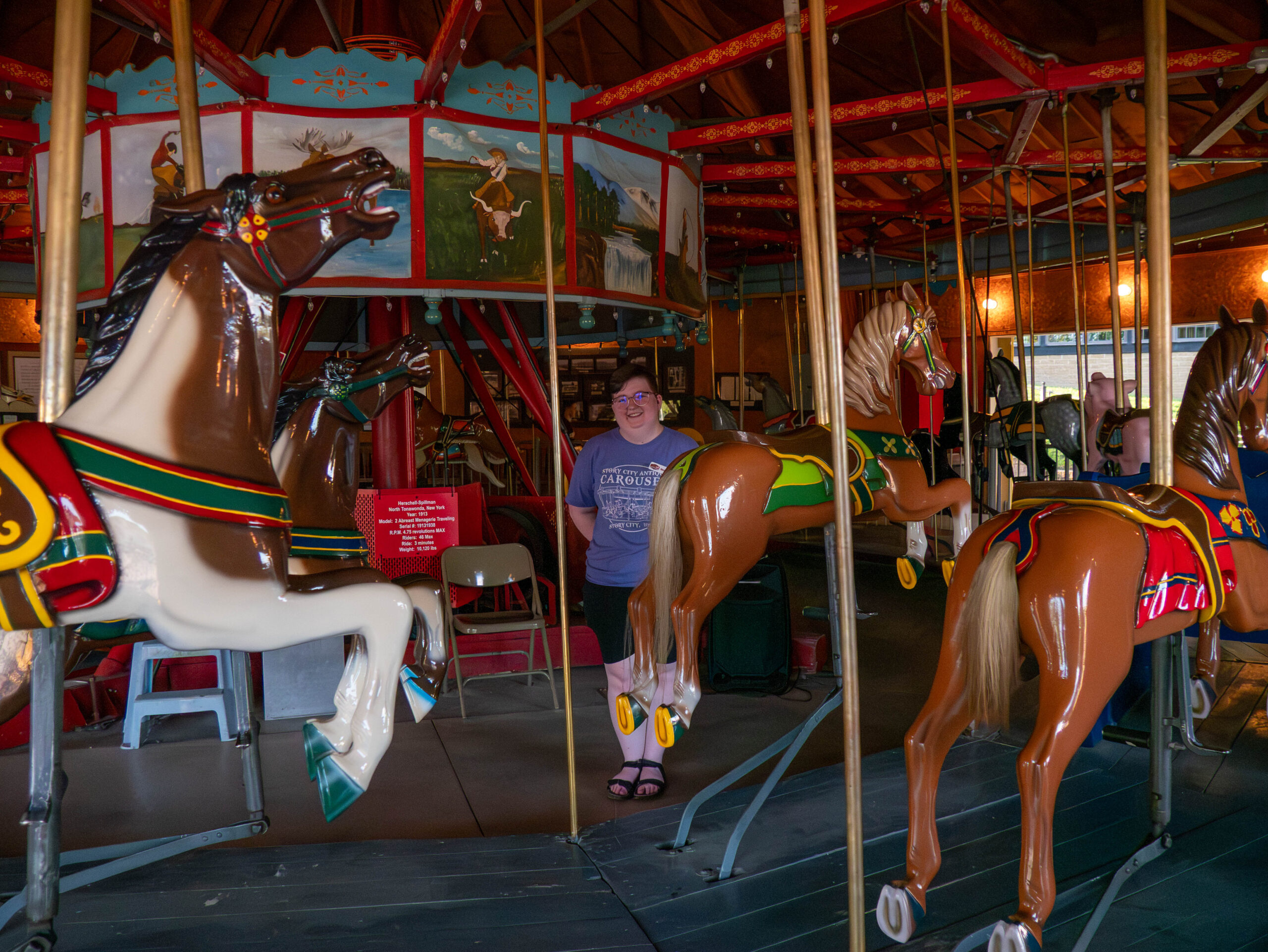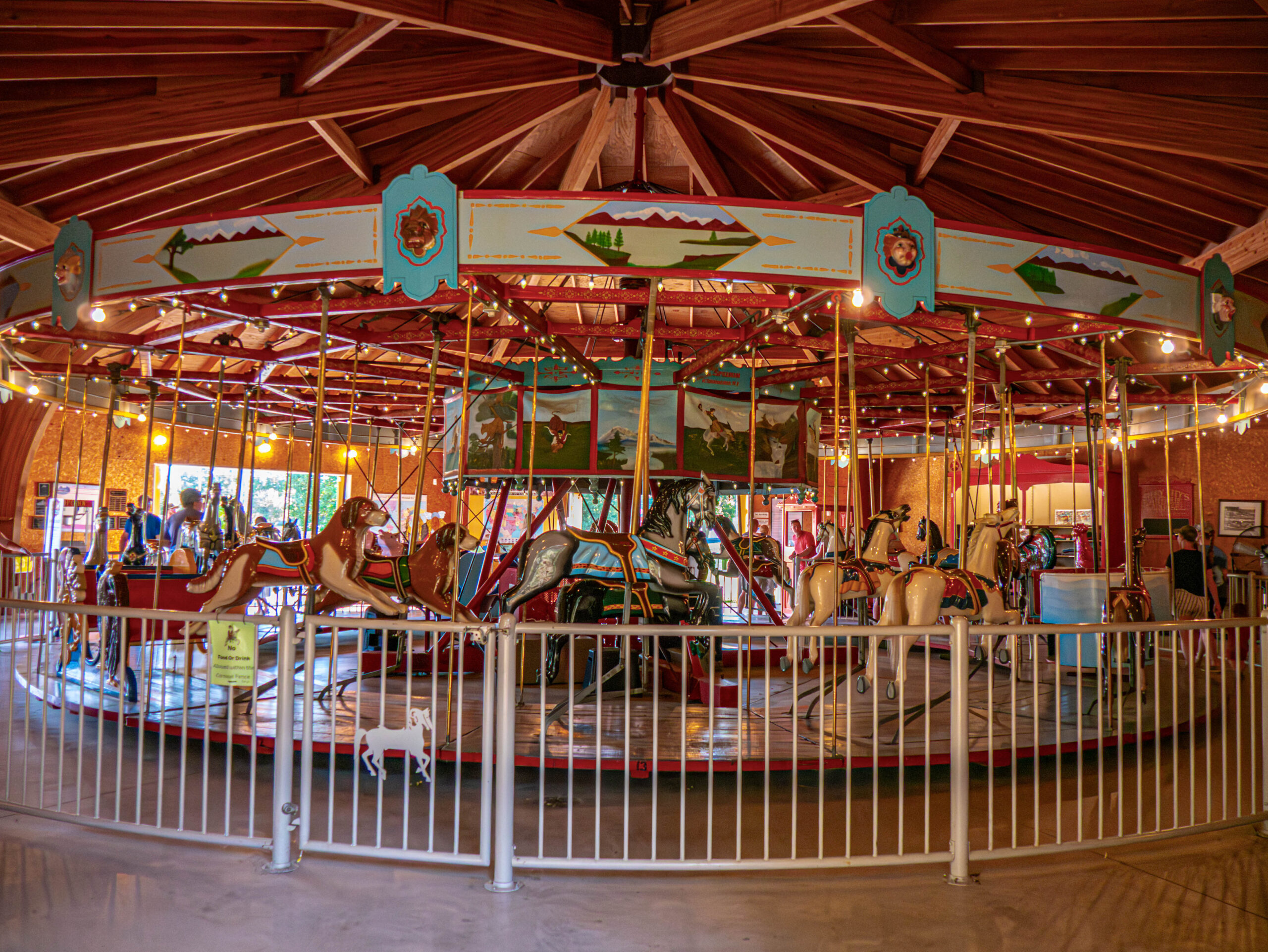 This beautifully restored 1913 carousel, built by the Herschell Spillman Company of New York, delights riders with hand carved poplar animals including 20 horses, plus pigs, dogs, chickens, and two chariots. Everything circles to the cheerful calliope tunes of a 1936 Wurlitzer Military Band organ.