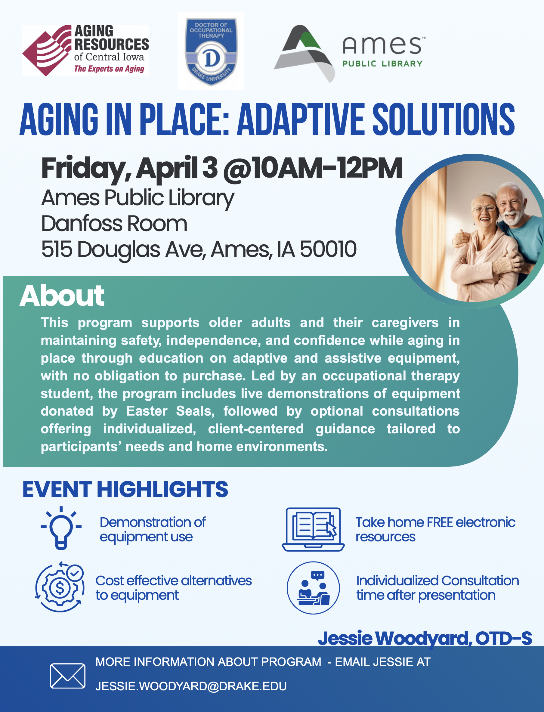 Led by an occupational therapy student, the program includes live demonstrations of equipment donated by Easter Seals, followed by optional consultations offering individualized, client-centered guidance tailored to participants needs and home environments.