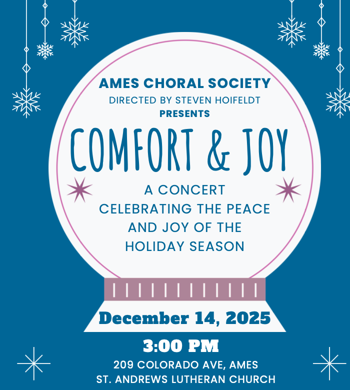 The Ames Choral Society wishes you “Comfort and Joy” this holiday season. Our concert will feature music that celebrates the peace and joy of the holiday season, including seasonal favorites “In the Bleak Mid-Winter” and “It Came Upon a Midnight Clear.” Upbeat “Hang the Holly” and “The Virgin Mary had a Baby Boy” will bring smiles to your faces.