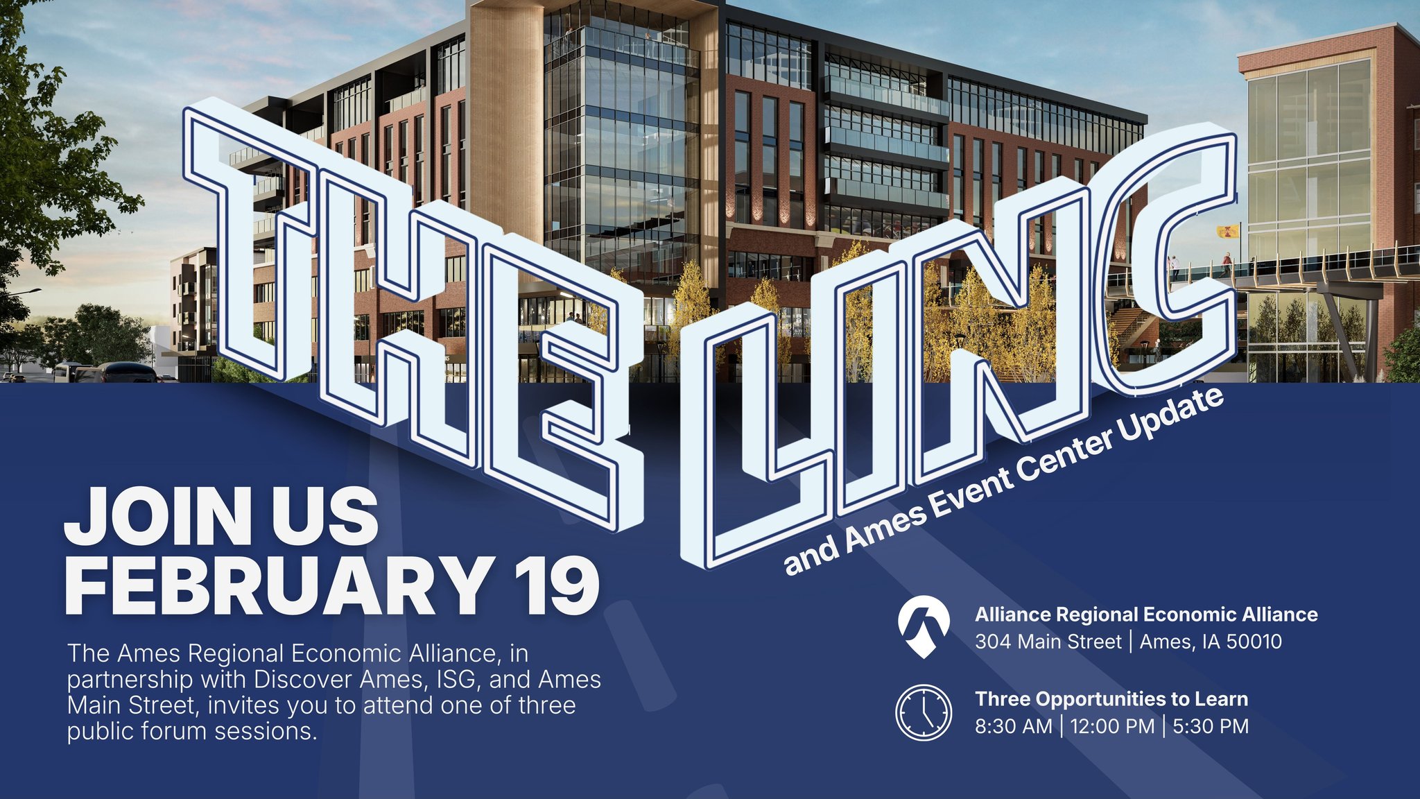 The Ames Regional Economic Alliance, in partnership with Discover Ames, ISG, and Ames Main Street, invites downtown business and building owners to attend one of three public forum sessions on Thursday, February 19, focused on the Ames Event Center and LINC projects, two transformational initiatives with significant implications for Downtown Ames.