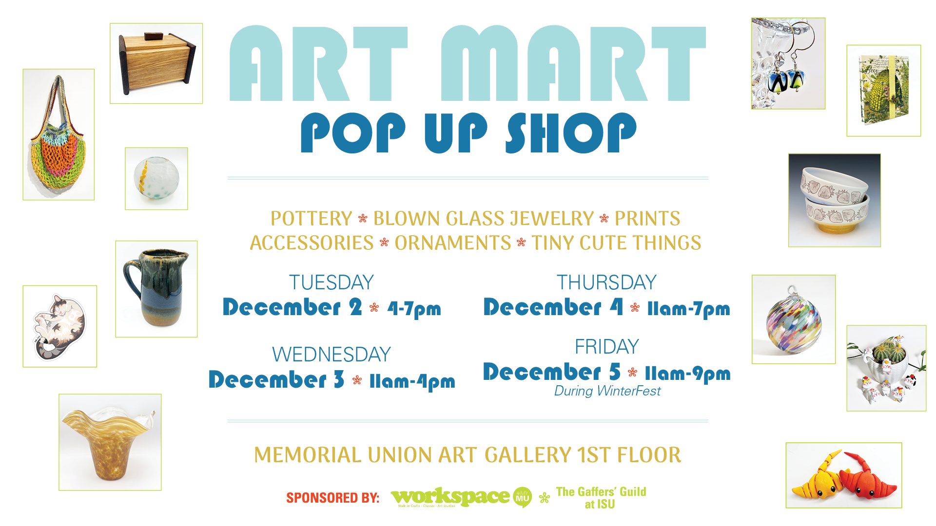 The annual holiday art sale at the Memorial Union will be held December 2 through December 5 in the MU Art Gallery located on the 1st floor. Hours are Tuesday 4-7pm, Wednesday 11am-4pm, Thursday 11am-7pm, and Friday 11am-9pm (remaining open during WinterFest).