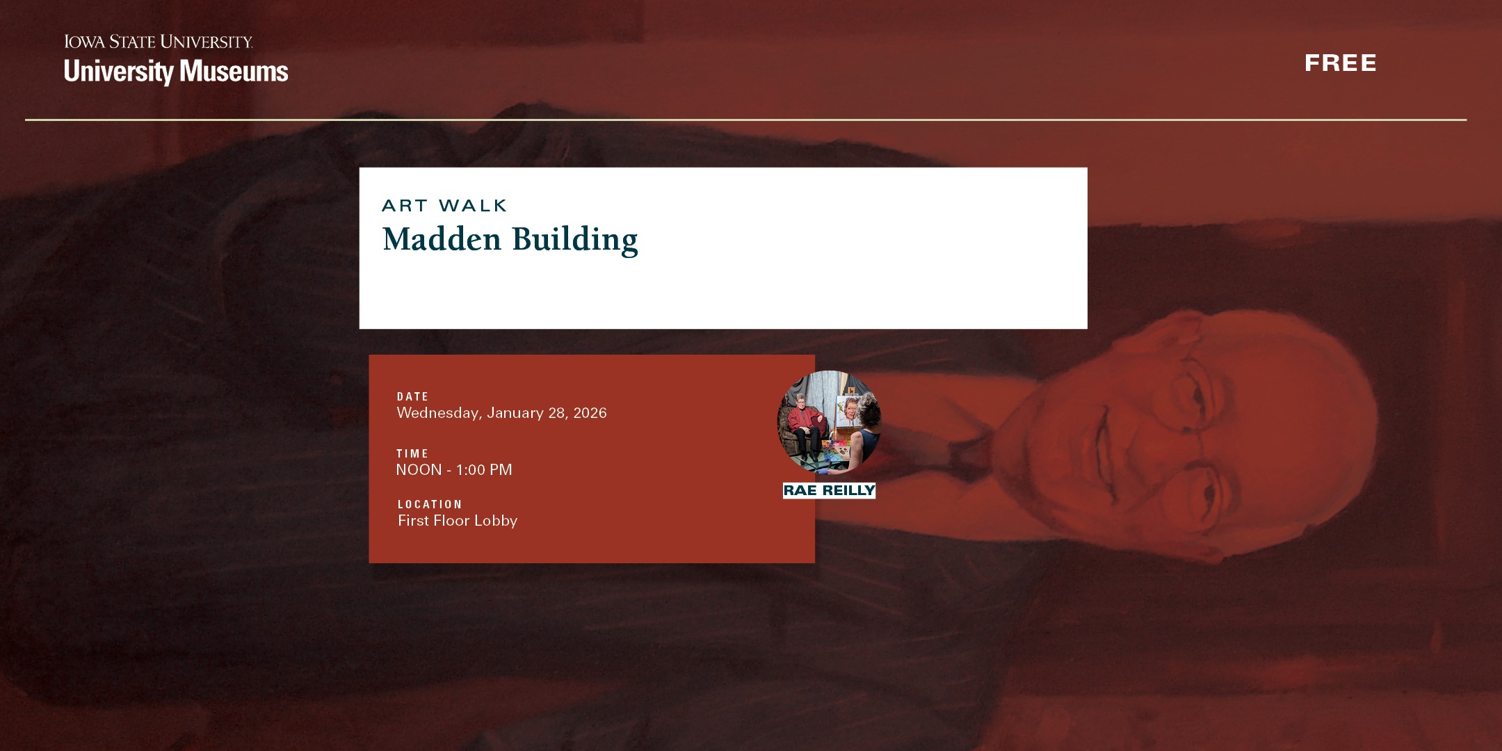 Ever been past a building on campus and wondered what’s inside? The newly updated Madden Building on the north side of campus features a delightful collection of Iowa artists and the official portrait of its namesake, Warren Madden. Join us on a free guided walk inside the building to examine selected works from a collection that is not the average “office art.” (Extra great if you work in the building and have wondered about the art!) Meet at Warren Madden Building, First Floor Lobby, 2221 Wanda Daley Drive, Ames, IA