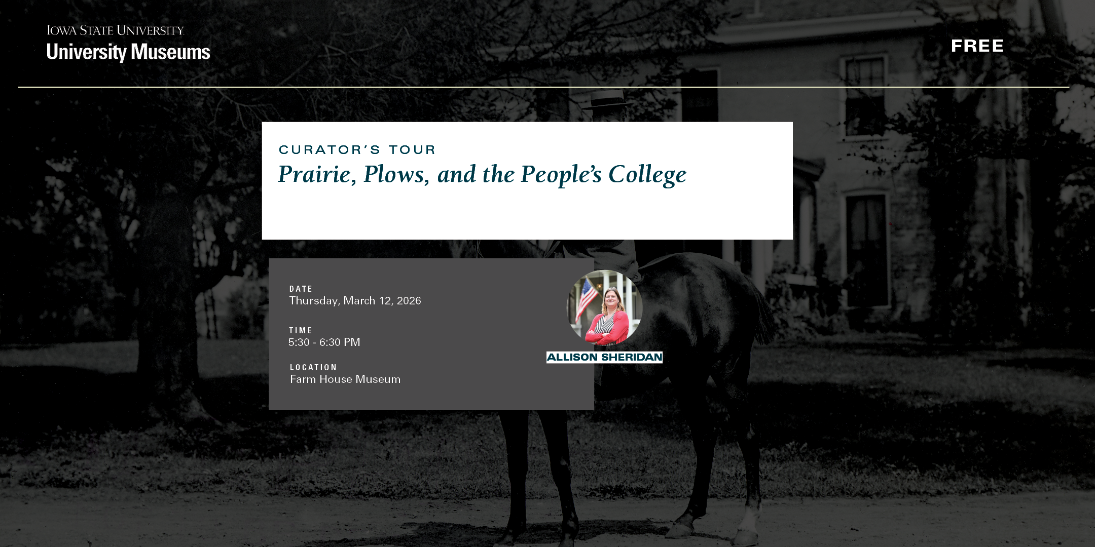 On July 4, 2026, the United States will commemorate the 250th anniversary of its founding. It’s not an exaggeration to say that the Farm House Museum, built in 1860 (before Iowa State even had students), is foundational not only to the development of campus and Iowa State University heritage, but also to state and national education, innovation, and policy. This tour highlights the exhibition America 250: Prairie, Plows, and the People’s College, open February 2 – October 2026. Recent ISU students helped identify and research 250 primary source objects for this exhibition.