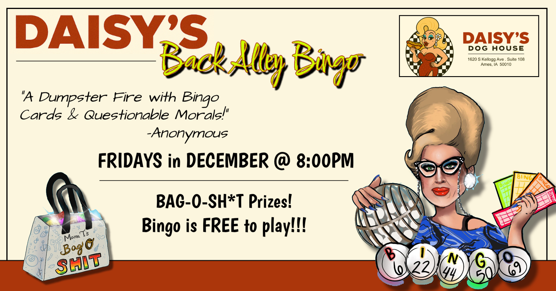 Join Daisy’s for the most delightfully questionable bingo night in Ames! Hosted by Vanessa Taylor. We’ve got your bingo cards and dabbers ready, all you need is a moral compass that’s already slightly bent. Bingo is FREE to play, and the stories you’ll leave with…..priceless.