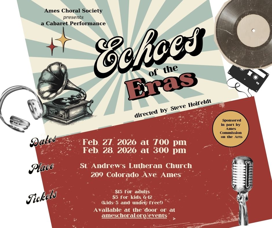“Echoes of the Eras”, the Ames Choral Society annual Cabaret performances, will feature familiar music from the past several decades that all will enjoy! There will be full chorus and small group numbers, plus solos from several members of the Choral society. We invite you to enjoy our shows on February 27 at 7 p.m. and February 28 at 3 p.m. Tickets are available online at ameschoral.org/events or will be available at the door.