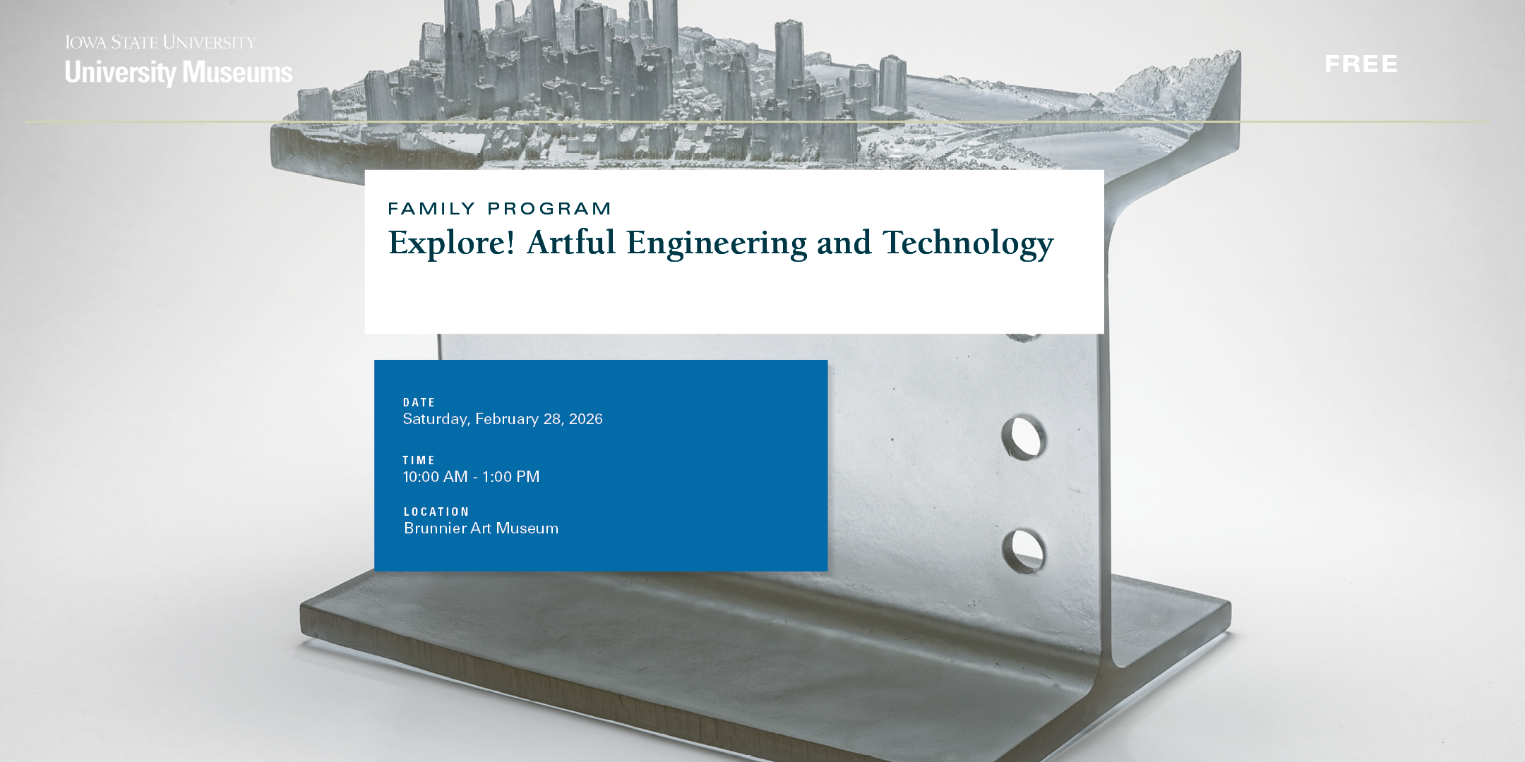Explore the fascinating connections between art and technology at the Brunnier Art Museum. Free activities and crafts for children and families will focus on cityscapes, mapmaking, 3D modeling, and technology. Find inspiration from the exhibition “Mapping Infrastructure / Mapping Agriculture,” by artist Norwood Viviano. Activities geared for grades K-5; all are welcome! Stop by any time during the three-hour window, while supplies last. No admission fee or registration.