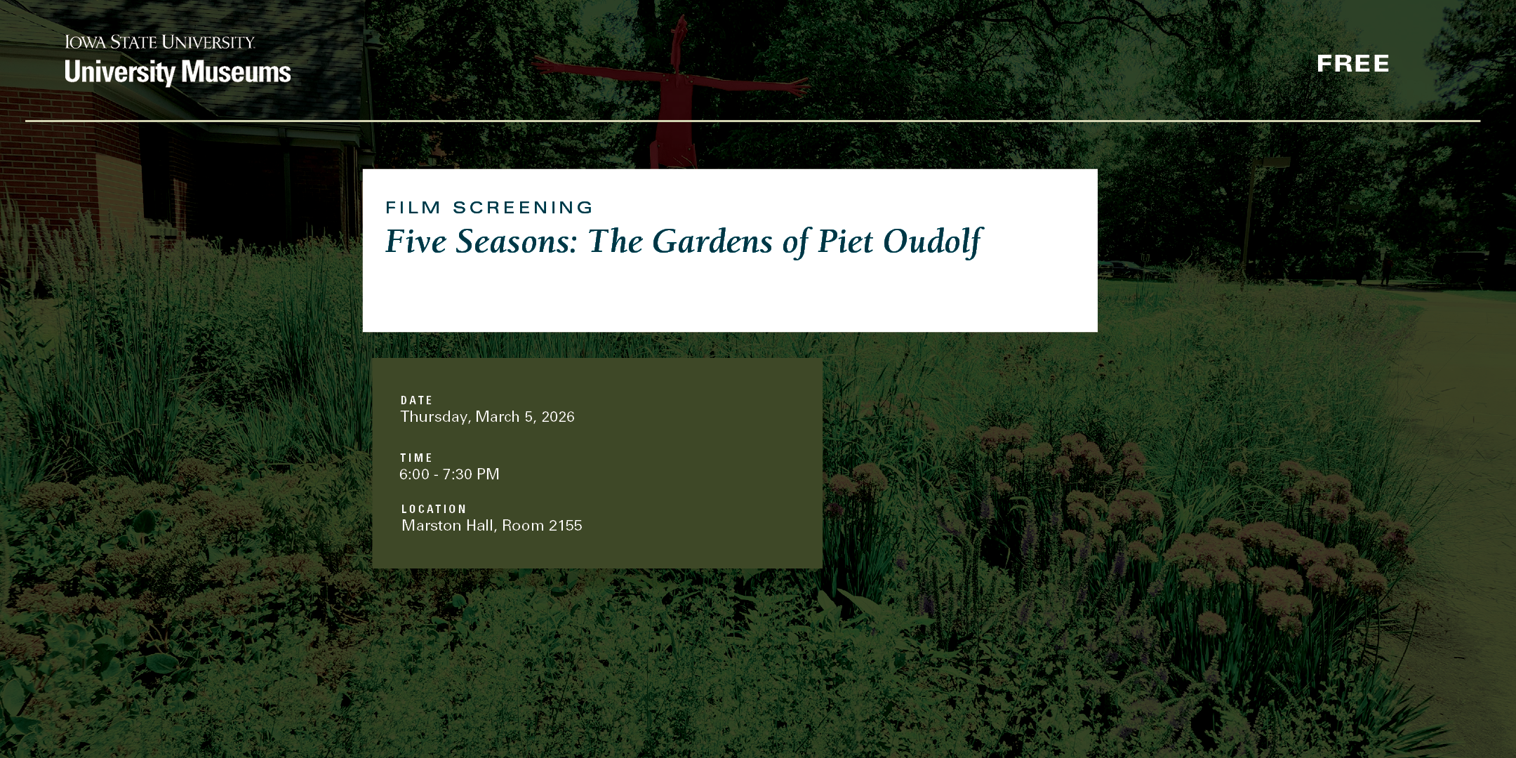 Experience the immersive documentary that follows legendary garden designer Piet Oudolf through the changing seasons. Known for designing the High Line and Battery Park City in New York City, and the Lurie Garden in Chicago, Oudolf’s “New Perennial” approach demonstrates how plants become an artist’s medium, forming living works of art that evolve throughout the year. As the mentor to Austin Eischeid (ISU ’11), designer of the Anderson Sculpture Garden’s A Moment in Time, Oudolf’s film offers a unique opportunity to connect what you see on screen with what’s growing on campus.