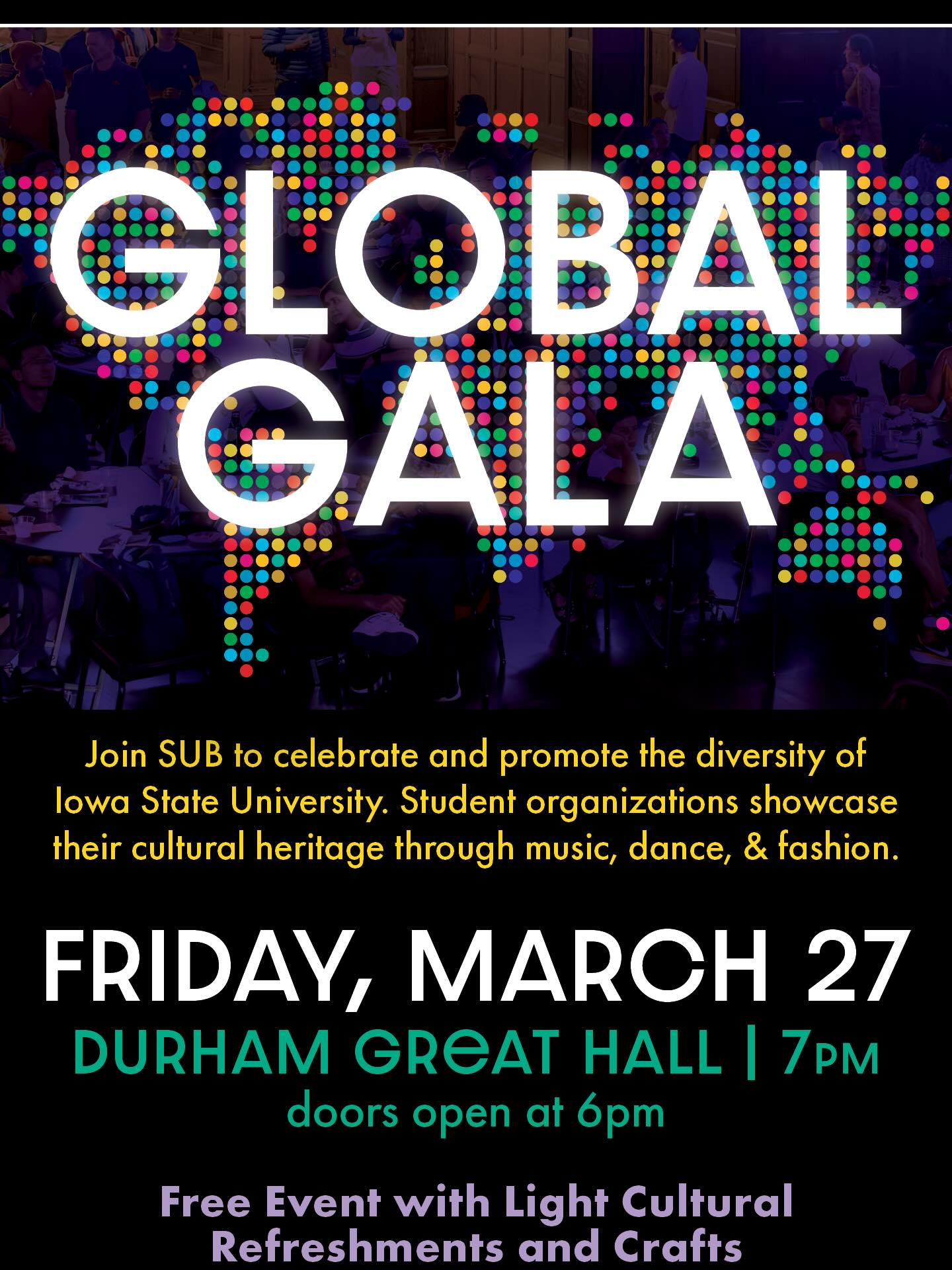 Join SUB to celebrate and promote the diversity of lowa State University. Student organizations showcase their cultural heritage through music, dance, & fashion. A variety of light refreshments will be served while a craft activity takes place.