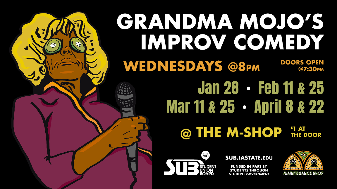 Don’t miss Grandma Mojo’s – Iowa State’s premier improv comedy troupe – every other Wednesday at the M-Shop in the Memorial Union for a night filled with hijinks and hilarity, all for only $1 at the door!