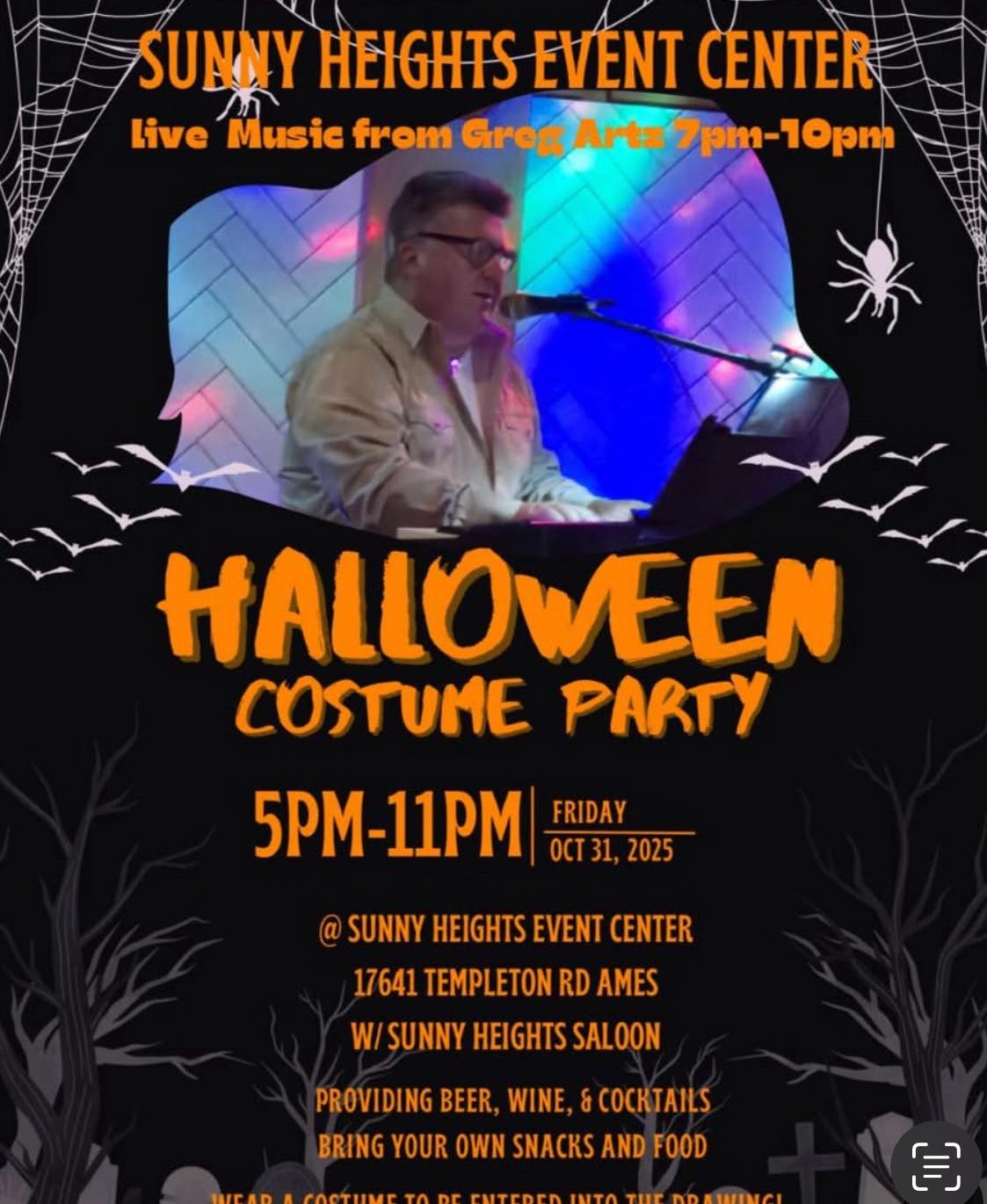 Celebrate Halloween at Sunny Heights Event Center in Ames on Friday, October 31st. The party starts at 5 pm to 11 pm. Dress in Costume and enter the drawing for prizes. Music provided by Greg Artz from 7pm ~10 pm. Hope to see you then…..it will be a spooktactular evening!! 👻 🎃