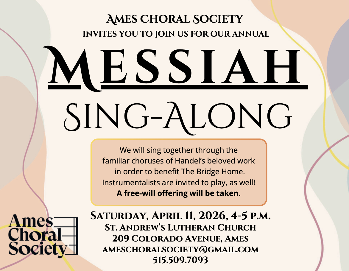 The Ames Choral Society invites singers and instrumentalists to come together to sing through the familiar choruses of Handel’s beloved work. In the spirit of Handel’s example of providing for the poor through performances of Messiah, a free will offering will be taken to benefit The Bridge Home. Scores will be available for singers to borrow, as well as some instrumental scores. Please join us!