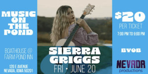 Nevada Productions is excited to announce Music On The Pond, a series of five Friday night acoustic shows this summer at The Boathouse at FarmPond Inn in Nevada! The series will feature Monica Austin, Sierra Griggs, Danny Grause Music, Luke Fox, and The Boys, playing from 7 pm to 9 pm. Tickets are $20, and season passes are available for $75 through May 31 (25% off total ticket value). Attendees may bring their own drinks and snacks; none will be for sale at the venue.