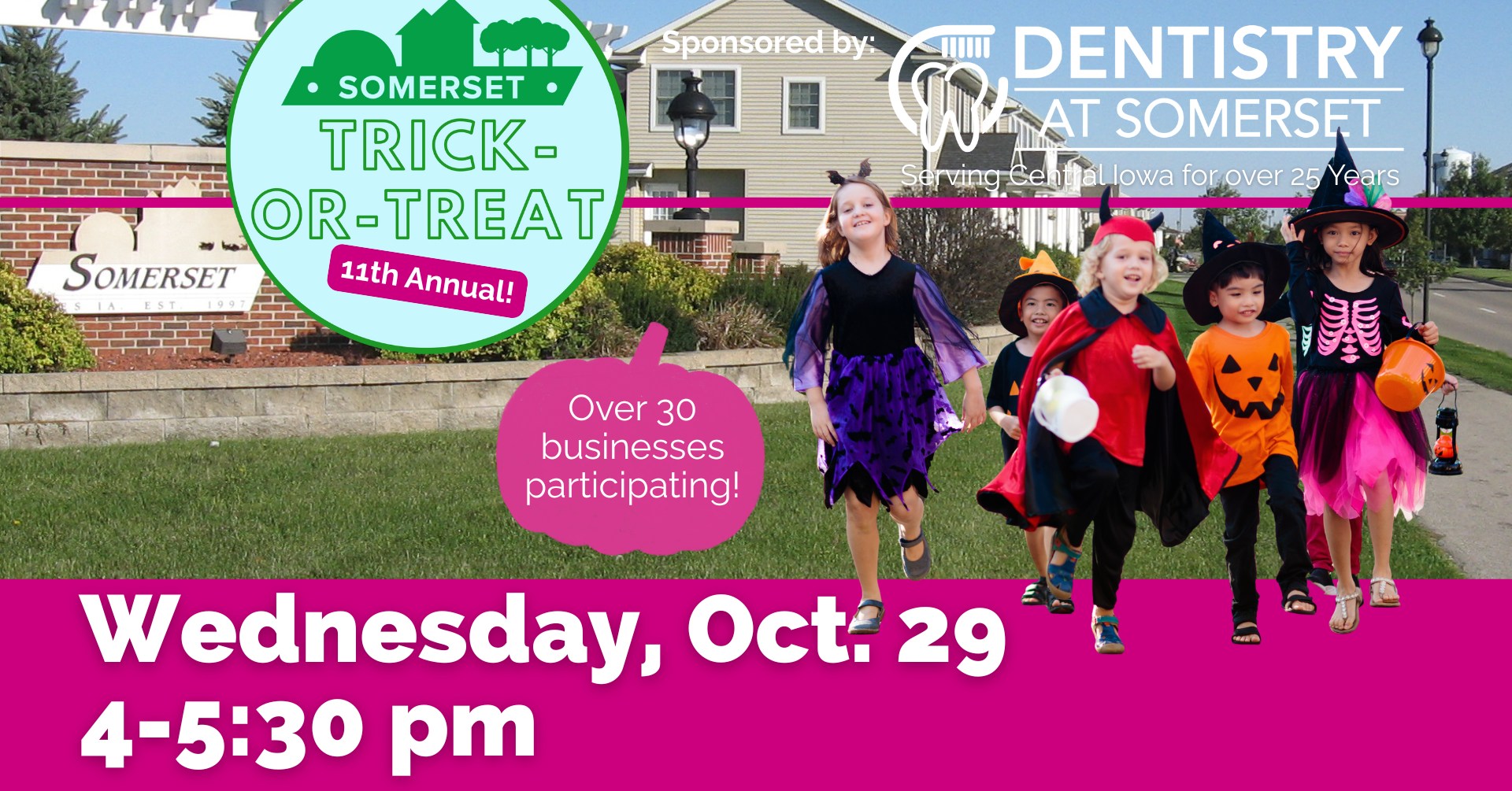 The 11th Annual Somerset Business Trick-or-Treat is Wednesday, Oct. 29 from 4-5:30! Over 30 businesses will have their doors open with treats, prizes and offers! Bring your kids out for fun and fill their candy bags full in our beautiful north Ames business district! Location is the intersection of Stange Road Northridge Parkway and surrounding streets.