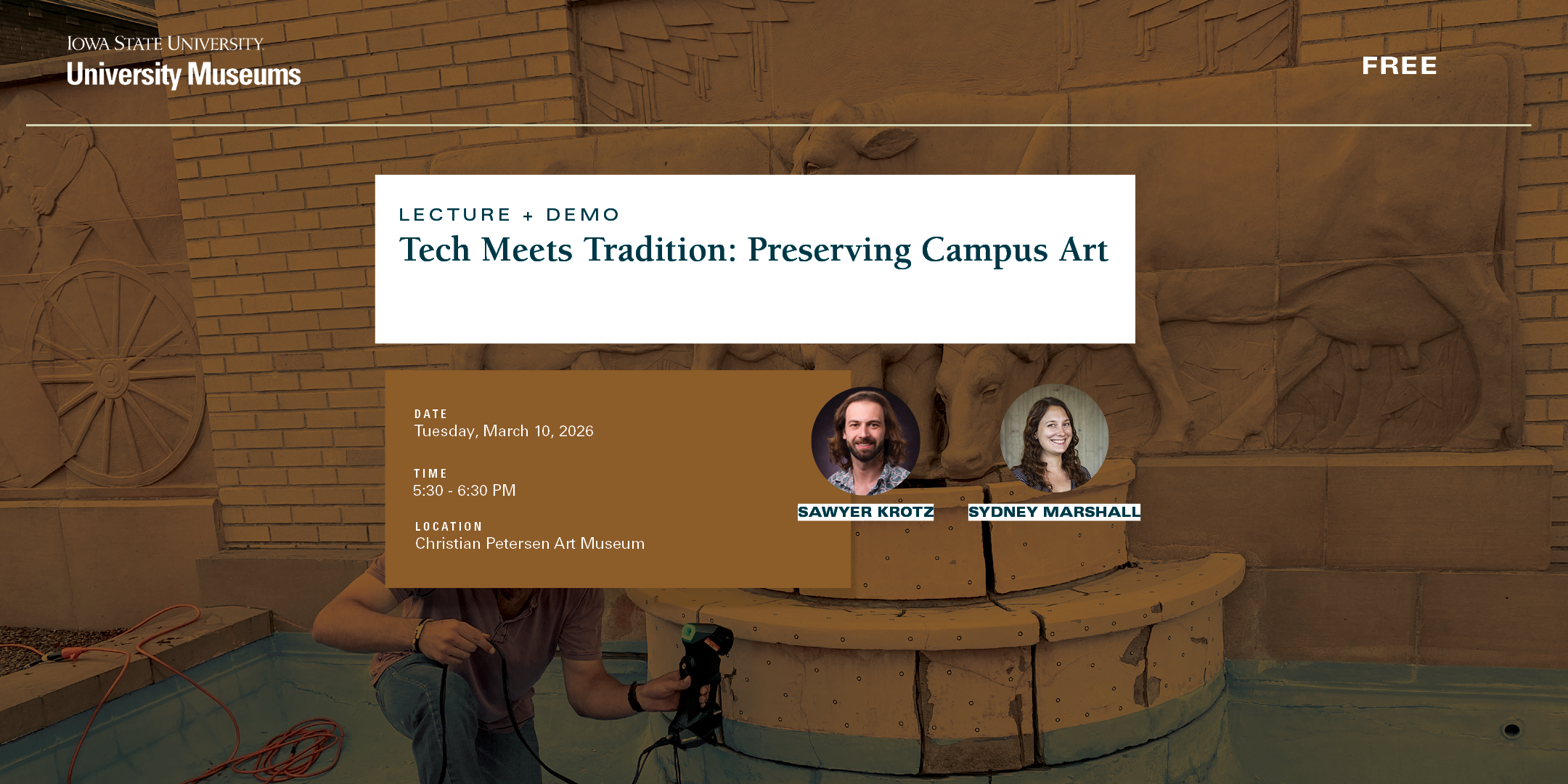 Iowa’s freeze-thaw cycles cause water to expand within terra cotta, breaking off surface material over time. Christian Petersen’s 1930s terra cotta sculptures have weathered this process for nine decades, and the exhibition puts examples of this damage on view. The scanning demonstration will reveal how Iowa State documented the “History of Dairying fountain” before replication. Digital files solve the centuries-old shrinkage problem inherent to terra cotta casting. These conservation techniques have applications beyond public art, including historic preservation and architectural replication. Especially great for anyone interested in materials engineering, museum conservation, or historic preservation—no technical background required.